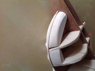 Otro problema que he encontrado es que el kit tampoco dispone de suficiente "volumen de relleno" entre las dos cuadernas de proa y la proa (en el resto tampoco). Ya se ve en la foto que el kit solo provee de un trozo de madera en la zona de máxima curvatura de proa hasta la cuaderna numero 2, pero luego queda vacío en la zona que va hacia la cubierta.